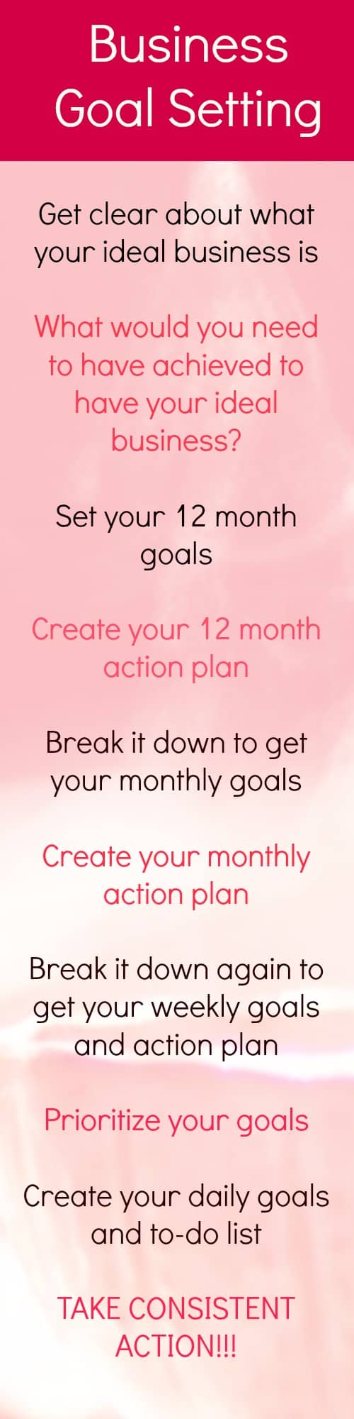 I encourage you to take consistent action. Using this GOAL SETTING method should go a long way to keeping focused. One thing I’ve been guilty of and see a lot of small business owners doing is getting side-tracked and going off course regularly.